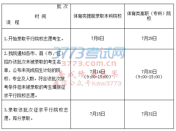 江苏省2017年体育类计划各批次录取安排批次 来源:江苏省教育考试院 批 次 时 间 流 程体育类提前录取本科院校体育类高职(专科)院校 1.开始录取平行院校志愿考生。7月8日7月29日 2.我院通知各市、县(市、区)招办该批次未被录取的考生名单,公布未完成招生计划的院校、专业及人数。符合该批次报考条件但未被录取的考生填报征求平行院校志愿。7月14日 (9:00-15:00)7月30日 (9:00-15:00) 3.录取该批次征求平行院校志愿,降分录取。7月15日7月31日