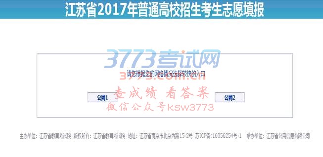 1、打开填报网址(http://gkzy.jseea.cn),进入“江苏省2017年普通高校招生考生志愿填报”界面首页。根据自己的网络情况,选择合适的入口。如果不知道自己的网络类型,可以将“公网1”、“公网2”按钮都点击尝试一下,选择速度较快的入口:
