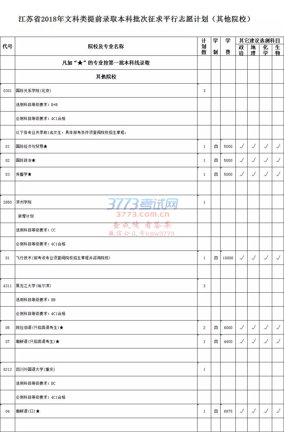 2018江苏本科提前批征求平行志愿计划:其他院校文理科