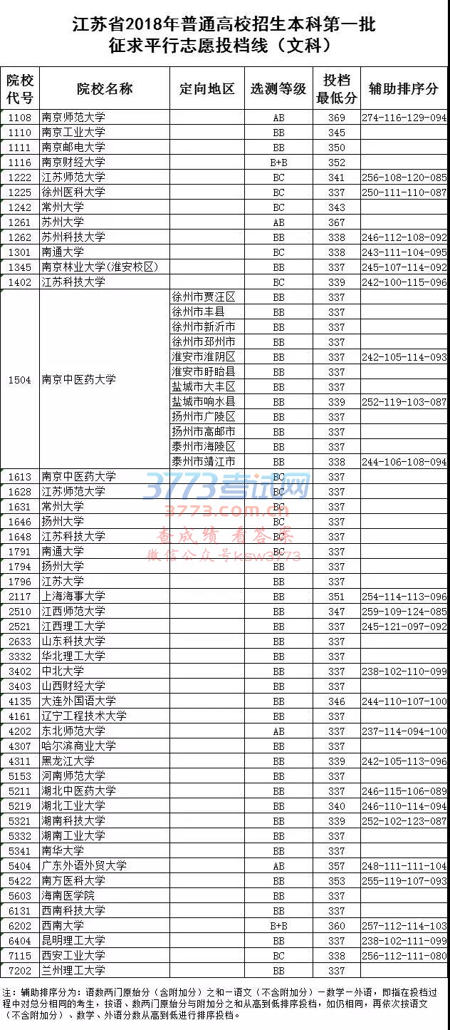 2018江苏高考本科第一批征求平行志愿投档线(文科)