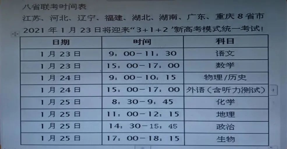 据了解,八省联考时间表已经出来了,江苏、河北、辽宁、福建、湖北、湖南、广东、重庆8省市2021年1月23日将迎来“3+1+2”新高考模式统一考试!