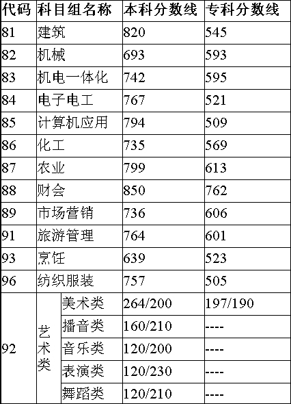 建筑本科线820分,专科线545分;机械本科693分,专科593分;机电一体化本科742分,专科595分;电子电工本科767分,专科521分;计算机应用本科794分,专科509分;化工本科735分,专科569分;农业本科799分,专科613分;财会本科850分,专科762分;市场营销本科736分,专科606分;旅游管理本科764分,专科601分;烹饪本科639分,专科523分;纺织服装本科757分,专科505分。