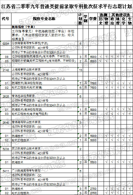 江苏省2009年普通类提前录取专科征求平行志愿计划
