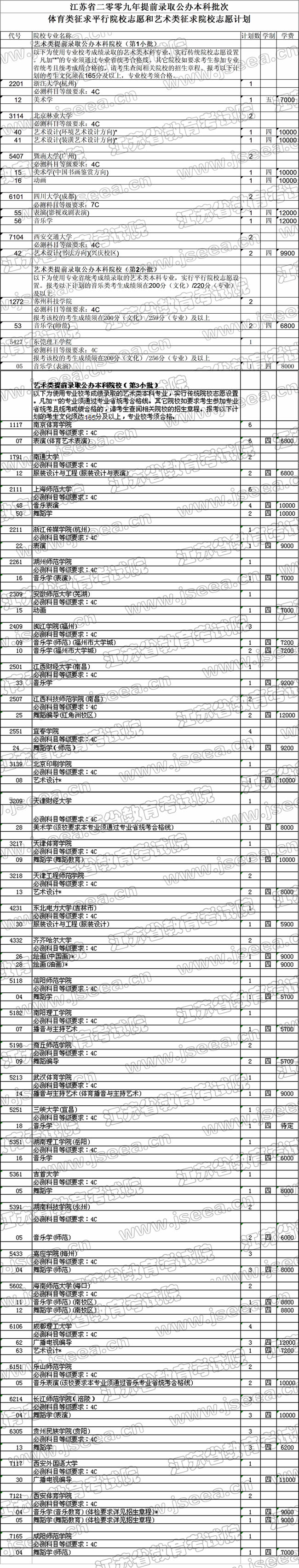 2009年江苏省体育艺术类提前录取公办本科征求平行志愿计划