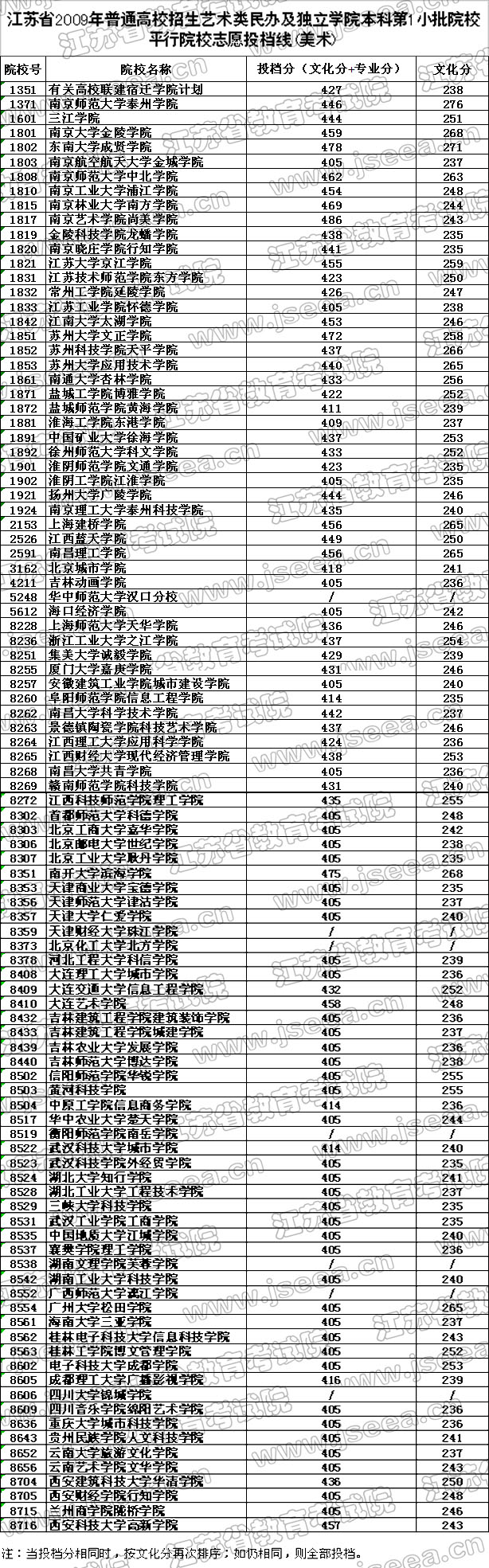 江苏省2009年艺术类民办及本科第1小批投档线(美术)