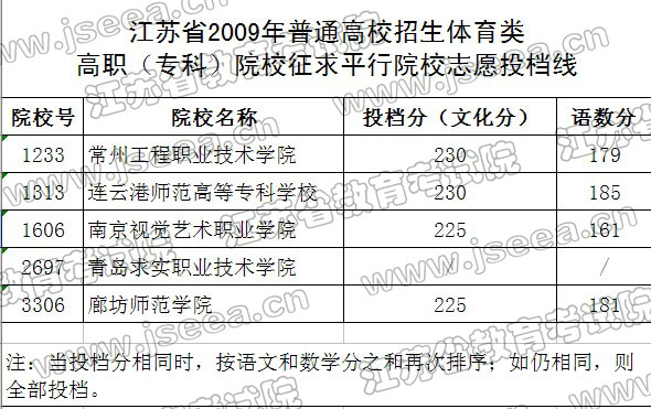 2009年江苏省体育类高职征求平行院校志愿投档线