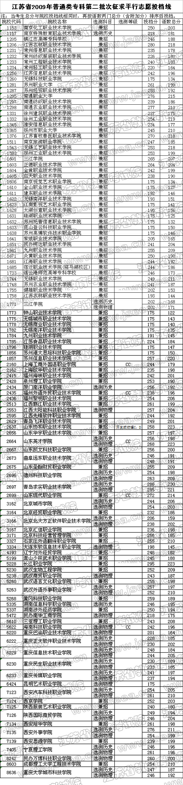 2009年江苏高考专科第二批次征求平行志愿投档线