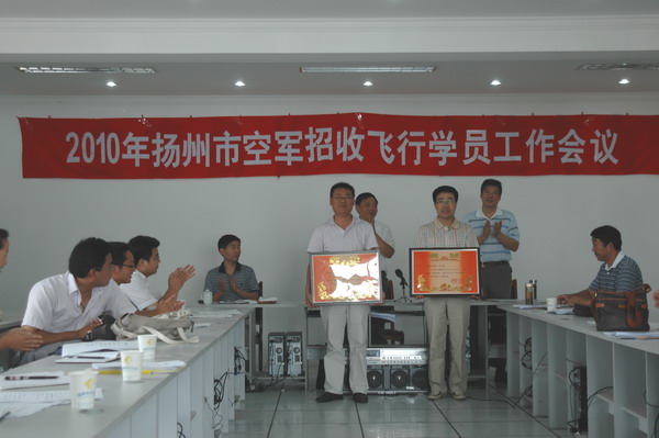 】8月28日,扬州市隆重召开2010年空军招收飞行学员工作会议。会议总结了该市2009年招飞工作,对涌现出来的五个先进单位进行了表彰,对2010年招飞工作进行了部署。各县(市、区)招办及市直学校近四十人参加了会议,市教育局党委副书记、副局长陆纪坤出席会议并作了重要讲话。会上,印发了扬教考[2009]31号《关于做好全市2010年空军招飞工作的若干意见》并就如何做好招飞各环节工作组织了经验交流。会议要求全市2010年招飞工作做到:一、要提高认识,加强领导,各地、各校要将招飞工作作为一项政治任务来抓;二、要广泛宣传,深入发动,在全市上下掀起踊跃报名,争当飞行学员的热潮;三、要力争提高“三率”。要面向所有应招青年,尽量提高送检率。在不误淘的前提下,严把“五查”关,各县(市、区)招办在学校“五查”后要组织再次把关,努力提高初检合格率。要狠抓“保苗”、“育苗”工作,努力提高出飞率;四、要认真开展各阶段工作,接受招飞工作年度考核评比;五、各地、各校要将招飞工作同素质教育结合起来,在开展招飞工作的同时,要对学生进行爱国主义和国防知识教育。