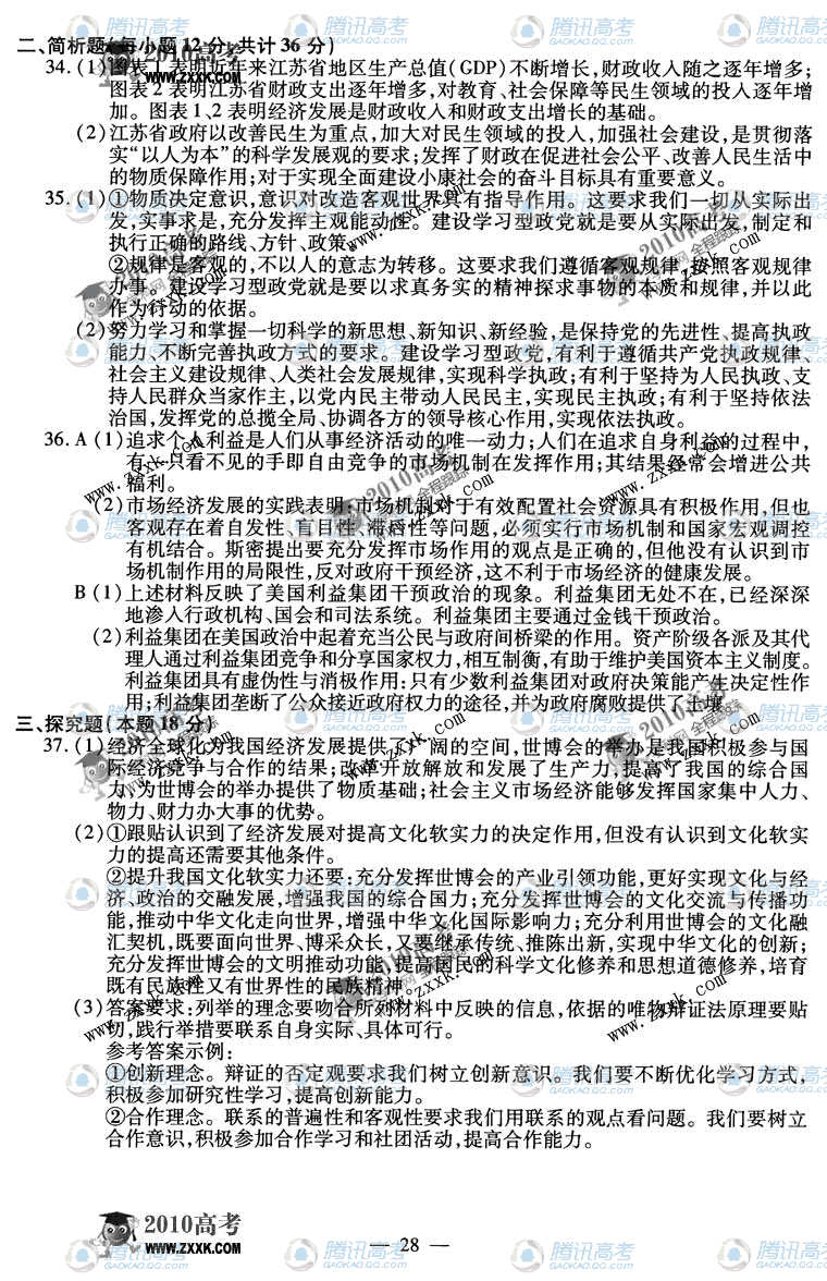 2010年江苏高考政治试题试卷答案
