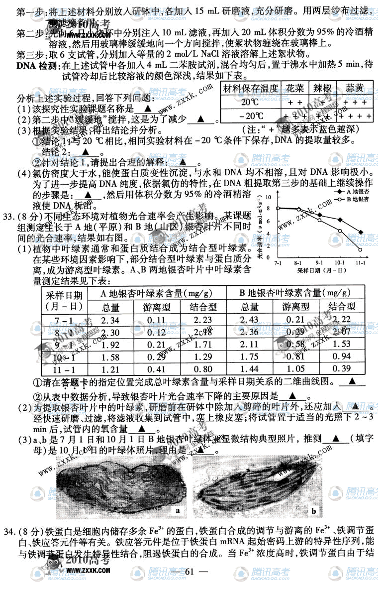 2010年江苏高考生物试题卷答案