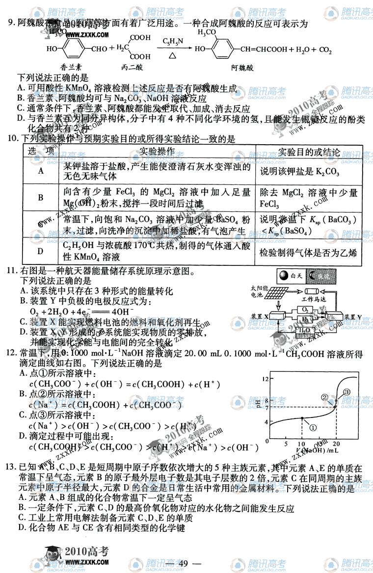 2010年江苏省高考化学试题答案