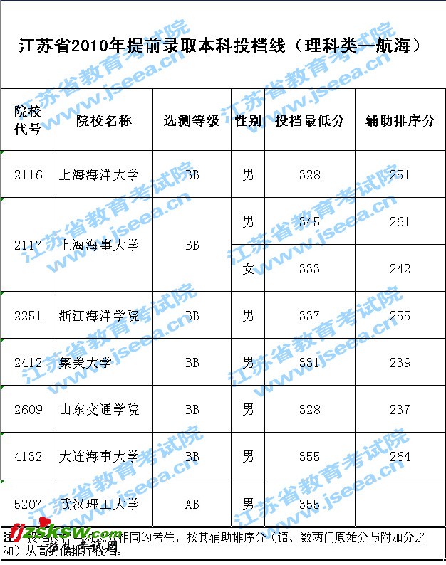 江苏省2010年提前批航海类本科投档分数线(文理科)