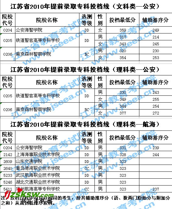2010年江苏省提前录取专科投档分数线含公安、航海类