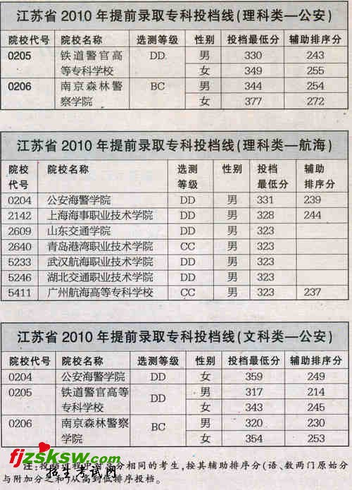 2010年江苏省提前录取专科投档分数线含公安、航海类