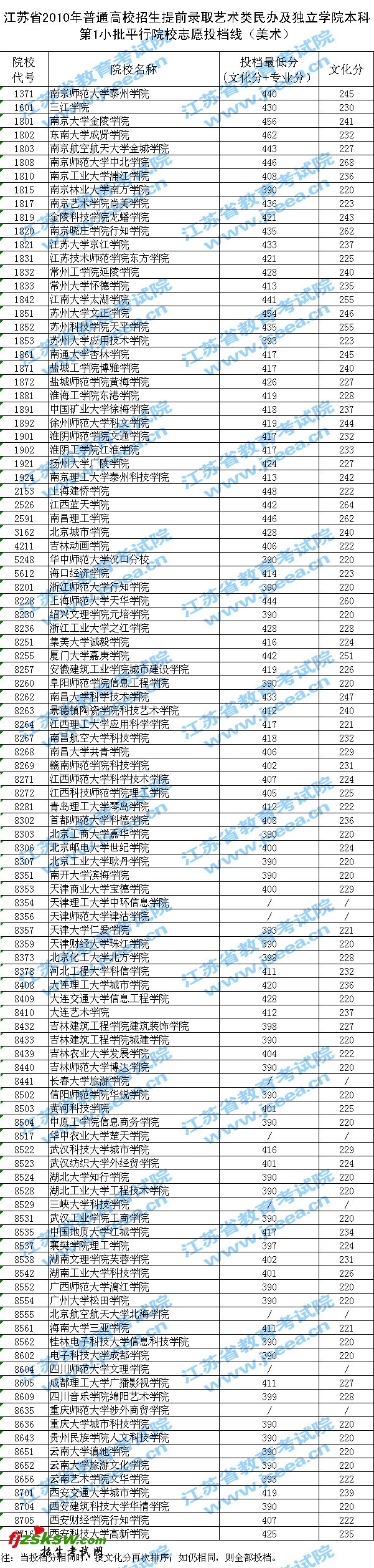 2010年江苏艺术民办本科1小批平行院校投档线(美术)
