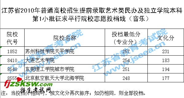 江苏省2010年提前录取艺术类民办及独立学院本科第1小批征求平行院校志愿投档线音乐