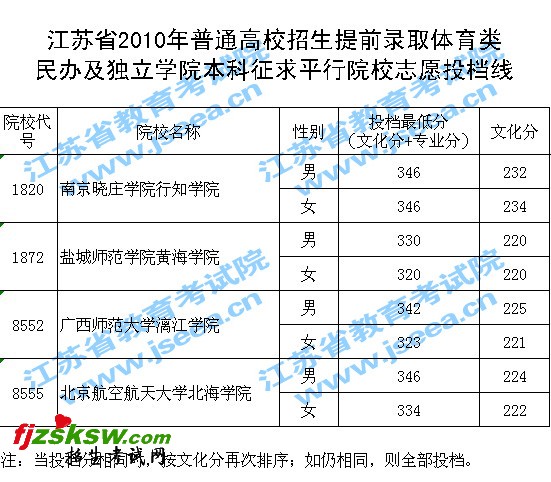2010年江苏省提前批民办体育艺术类征求志愿通告