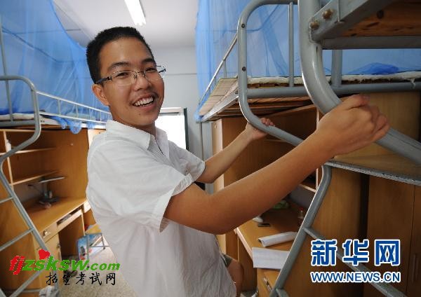 8月28日,王云飞在东南大学宿舍里准备整理床铺。新华社记者孙参摄
