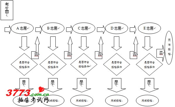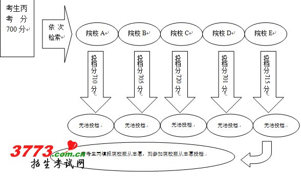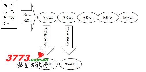 举例一,机械科目组考生乙,考分700分。机械科目组投档,计算机检索到该生时,首先检索该生填报的A院校,假设A院校计划已投满,且投档最低分为710分,该生不符合投档条件,无法投往该校,则继续检索B院校,假设B院校计划未投满,则该生档案投往B院校,计算机不再检索C、D、E志愿。依此类推(如下图所示)