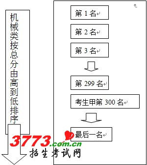 第一步,分科目组先对考生按总分从高到低排序,分数高的考生先检索投档。比如某机械科目组考生甲成绩排在全省机械科目组考生的第300名,需要前面299人检索处理完成后,才轮到这位考生(如下图所示)。