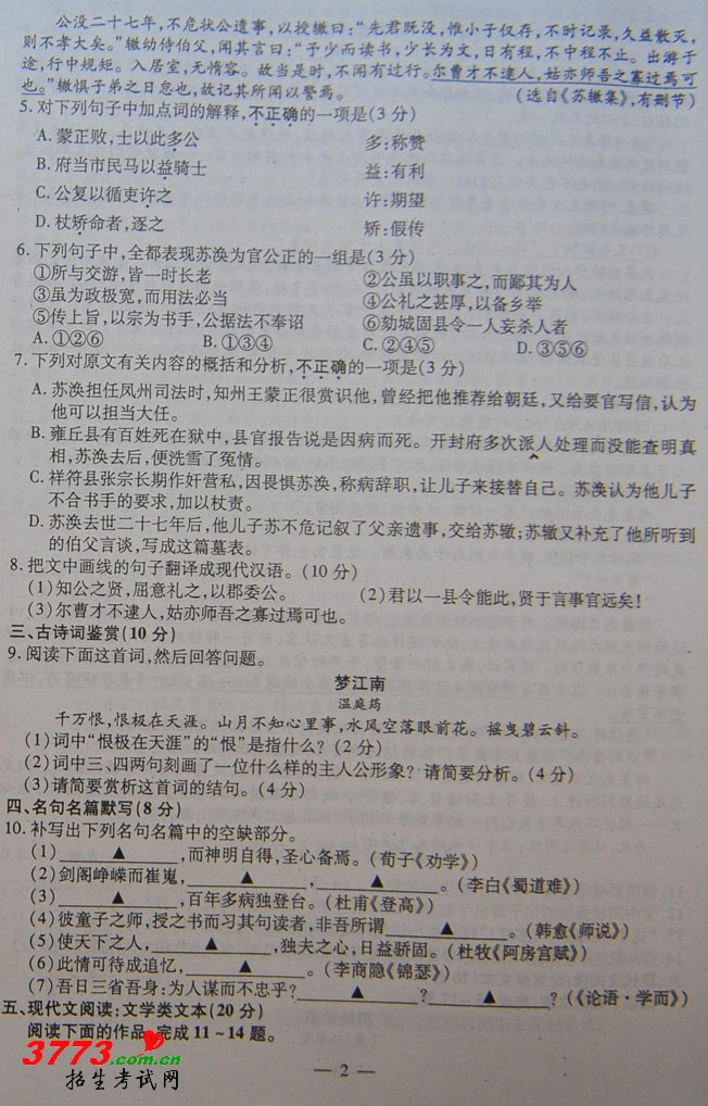 2012年江苏高考语文试卷及参考答案