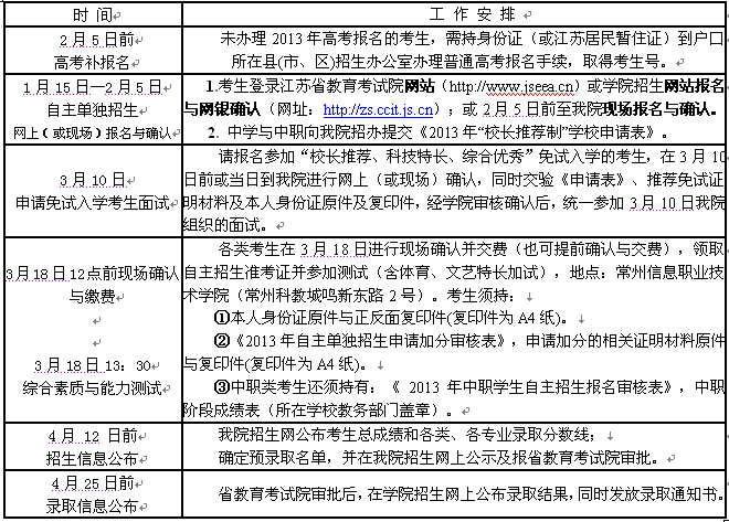④申请推荐免试入学资格的考生须已办理2013年高考报名手续,并登录我院自主单独招生网站进行了网上报名。3月10日前或当日到常州信息职业技术学院进行现场确认,同时交验《申请表》、推荐免试证明材料及本人身份证原件及复印件,经学院审核确认后,统一参加3月10日我院组织的面试。面试通过后的考生名单将在学院网站公示一周,无异议后,报省教育考试院审批,审批通过后按考生第一专业志愿录取。