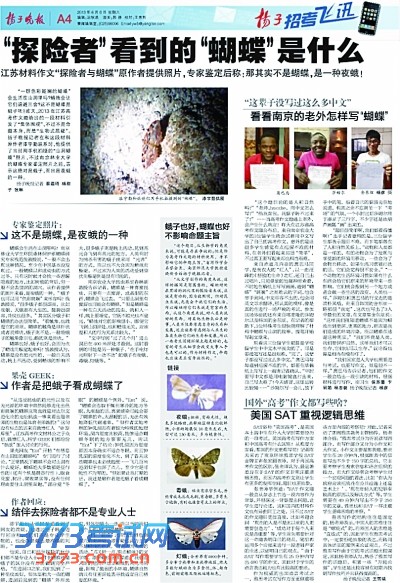 今年语文科目刚结束,一场关于“蝴蝶还是蛾子”的争论就在热闹进行了:黑暗的山洞里会有色彩斑斓的大蝴蝶吗?蝴蝶研究专家分析认为,从材料原作者描述的情况看,所谓的“蝴蝶”应该是夜蛾的一种。而材料原文作者提供的图片更证明了这一点。让人意外的是,江苏还真有考生看了材料之后,没有按照常规思路去“立意”,而是用自然科学的方法去论证、推断这些“色彩斑斓的蝴蝶”其实应该是蛾子。“这篇文章写得十分精彩,推理丝丝入扣,我们也给了这位考生打了高分。”作文阅卷老师表示。