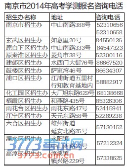 中国江苏网10月30日讯 2014年江苏省高考及学业水平测试报名工作将于11月1日至7日进行,南京市招生办昨天公布区县高考学测报名咨询电话,特别提示广大考生注意相关事项。