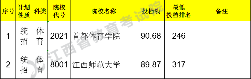 江西省2021年普通高校招生第一批本科体育类缺额院校征集志愿投档情况统计表