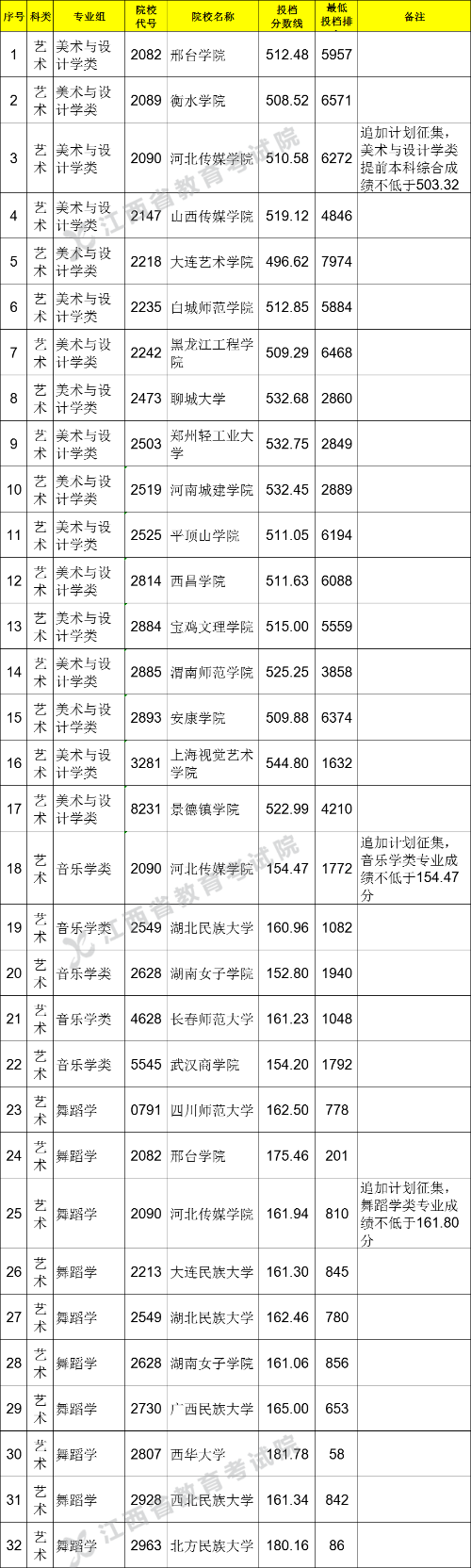 江西省2021年普通高校招生提前批本科缺额院校征集志愿投档情况统计表(艺术类平行志愿)