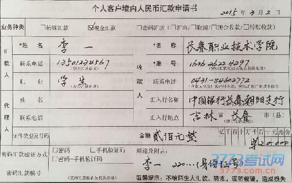 2016长春职业技术学院单独招生考生银行汇款缴费须知