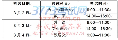 高职单招文化素质考试科目为语文(使用朝鲜族语言文字答卷为朝语文和汉语文)、数学、外语,实行全省统一考试,与高职对口升学文化素质考试同步进行。职业技能测试由招生院校在3月19日——20日期间自主实施,详细情况可到招生院校网站查询。