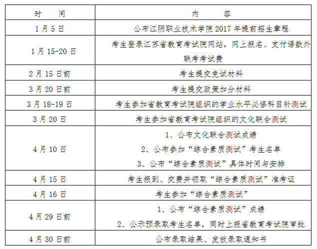 (2)其他需要说明的情况①申请“文化联合测试免考”的考生须已办理2017年高考报名手续,并登录江苏省教育考试院提前招生报名端口进行网上报名。经我院提前招生工作领导小组进行资格审核并确认后,统一参加我院组织的“综合素质测试”。②申请“学业优秀”免试的考生,我院会根据省教育考试院提供的报名信息给予其免试资格,考生无需填写《江阴职业技术学院2017年提前招生“文化联合测试免考”申请表》。③申请“素质优秀”“科技特长”“体艺特长”免试的考生,需在我院招生信息网“提前招生”专栏下载《江阴职业技术学院2017年提前招生“文化联合测试免考”考生申请表》,填写并确认后与相关证明材料复印件于2月15日前通过EMS寄至江阴职业技术学院招生就业处李笑晨老师,江苏省江阴市锡澄路168号,邮编:214405,联系电话:0510-86022665,0510-86022887注明“提前招生免考材料”,“综合素质测试”报到时提供相关证明材料原件复核。④符合“文化联合测试免考”的考生,其文化测试成绩按满分值折算,即150分。⑤凡达到免试条件,但未向我院申请“文化联合测试”免考的考生,必须参加省文化联合测试,录取时按其实际文化测试成绩计分。⑥经我院提前招生工作领导小组进行资格审核并确认后,免考考生名单将在学院网站公示十天,无异议后,报省教育考试院审批备案。(二)综合素质测试1、综合素质测试报到时间:2017年4月15日,考生来校前,须准备好身份证、联合测试准考证,以及免文化测试或符合加分政策的证明材料原件。综合素质测试时间:2017年4月16日。综合素质测试地点:江阴职业技术学院综合素质测试对象:(1)免试生,包括报考我院的文化普通类、艺术类、体育类考生。(2)参加省联测的学生2、综合素质测试形式与内容:在省教育考试院的指导与监督下,综合测试按照多重随机的原则组织进行。(1)免试生免试考生采用面试考核,普通生主要考核考生的综合素质、职业倾向、职业潜能、心理素质等基本素质。特长生由学院相关部门组织进行专项测试。(2)联测学生当报考的学生数大于招生计划数,联测学生需参加学校组织的机测,主要考核考生的文化素质、心理素质综合素质、职业倾向、职业潜能等基本知识与基本素质。 3、综合素质测试总分为150分。 4、报到说明:(1)报到流程交验考人身份证、联合测试准考证,以及免文化测试或符合加分政策的证明材料原件→缴纳面试考核费用→领取准考证→熟悉考场。(2)交验材料 a、身份证原件、复印件(A4纸); b、考生“素质优秀”“科技特长”“体艺特长”材料原件; c、考生加分材料原件; d、联合测试准考证(3)考生必须持准考证和身份证方可参加面试。 (4)报名考试费:按政策文件规定。七、收费标准文化联合测试考试费:按照苏价费函〔2010〕56号文件有关学业水平测试必修科目的规定收取(45元/考生,报名时网上支付)。综合素质测试报名考试费:按照苏价费函〔2007〕423号文件,报名费20元/考生,综合素质测试费60元/考生,合计80元/考生(考生来我院报名参加测试时现场收取)。八、加分政策1.烈士子女,录取时加10分;2.自谋职业的退役士兵,录取时加5分;3.在服役期间荣立二等功(含)以上或被大军区(含)以上单位授予荣誉称号的退役军人,录取时加10分;4.归侨、归侨子女、华侨子女和台湾省籍考生,录取时可加10分;5.少数民族考生录取时加3分。6.申请加分项目考生需在我院招生信息网“提前招生”专栏下载《江阴职业技术学院2017年提前招生加分申请表》,填写并确认后与相关证明材料复印件于3月20日前通过EMS寄至江阴职业技术学院招生就业处李笑晨老师,江苏省江阴市锡澄路168号,邮编:214405,联系电话:0510-86022665,0510-86022887,请注明“提前招生免考材料”,“综合素质测试”报到时提供相关证明材料原件复核。7.加分情况,经我院提前招生工作领导小组进行资格审核并确认后,考生名单将在学院网站公示十天,无异议后执行。九、录取规则录取工作在省教育考试院领导下,由我院统一组织录取,录取过程坚持公平、公正、公开,德智体美全面衡量。(一)录取总分:文化联合测试+综合素质测试+政策加分;(二)划线原则:根据我院招生计划数按1:1.2确定进档人数,按考生总成绩从高到低排序后进档,以进档考生最低分为录取控制线。(三)录取原则:对进线考生,按考生总成绩由高分到低分录取,同分考生按综合素质测试成绩高低依次排序; (四)录取要求:所有考生须参加高考体检且体检结果符合高校招生体检指导意见的相关要求,否则不予录取。(五)拟录取名单经省教育考试院审批同意后,我院发放录取通知书,录取结果在我院招生信息网上公布; 十、日程安排