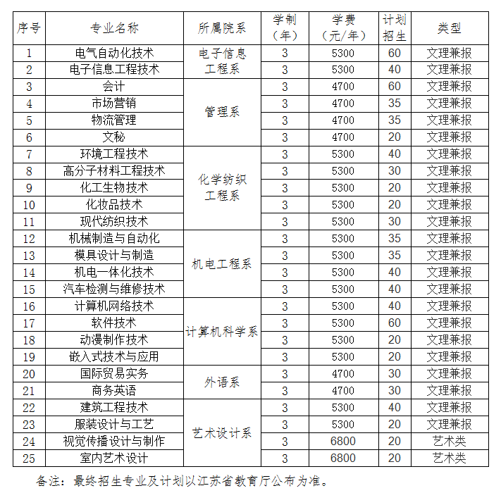 根据教育部、江苏省教育厅有关文件精神,结合我院实际,特制定本章程。 一、指导思想和录取原则1.指导思想:贯彻落实十八大、十八届三中、四中全会和全国职教工作会议精神,深化高职院校招生考试制度改革,进一步完善多元选拔录取机制,提升我院生源质量和办学水平;通过提前招生,充分落实高校办学自主权,择优选拔适合在高职院校相关专业学习的考生,培养高素质技术技能型人才。2.录取原则:提前招生选拔录取工作坚持学校负责,省教育考试院监督,遵循“公开程序、公平竞争、公正选拔,全面考核、综合评价、择优录取”的原则。 二、招生范围及对象 1.江苏省内具有普通高中学历,并报名参加2017年普通高校招生考试的应往届毕业生,且满足以下要求:(艺术类考生报考普通类专业时,等级要求同普通类。)