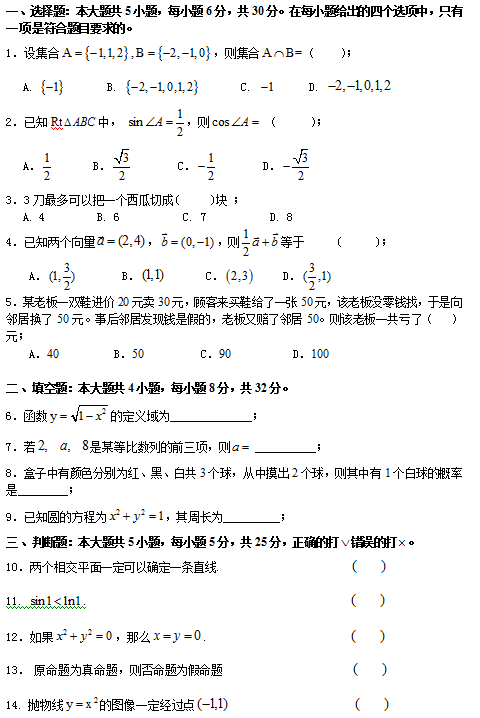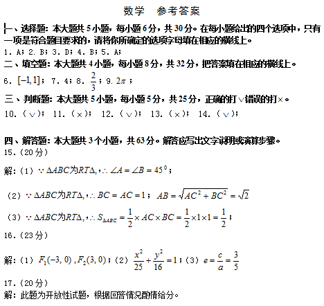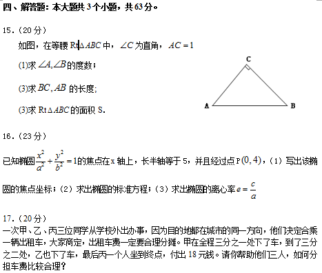 2016年九江职业技术学院单独招生考试《数学》样卷