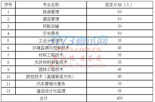 招生专业及招生计划 序号专业名称招生计划(人) 1旅游管理50 2酒店管理50 3民航运输30 4空中乘务50 5工业分析技术35 6环境监测与控制技术45 7材料工程技术35 8光伏材料制备技术35 9园林工程技术45 10数控技术(高端制造方向)45 11汽车营销与服务35 12通信设计与监理35 合计490