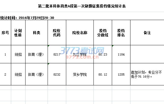 江西高考第二批本科体育类A段第一次缺额征集投档情况统计表