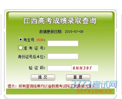江西省2015年高招录取7月8日正式开始。 数据更新日期:考生号 1536: 准 考 证 号: 身份证号后4位: 验 证 码: 提示:所有查询结果均以省教育考试院正式通知为准。
