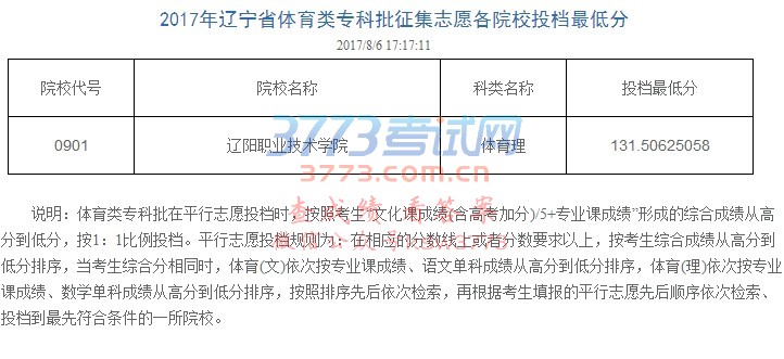 2017年辽宁省体育类专科批征集志愿各院校投档最低分