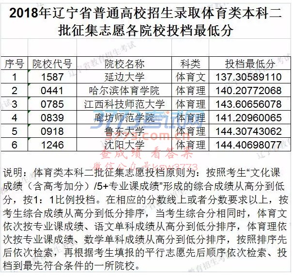 2018年辽宁省普通高校招生录取体育类本科二批征集志愿各院校投档最低分