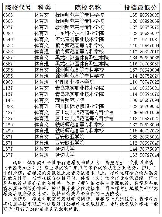 2019年辽宁省普通高校招生录取体育类专科批投档最低分