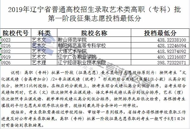 2019年辽宁省普通高校招生录取艺术类高职(专科)批第一阶段征集志愿投档最低分