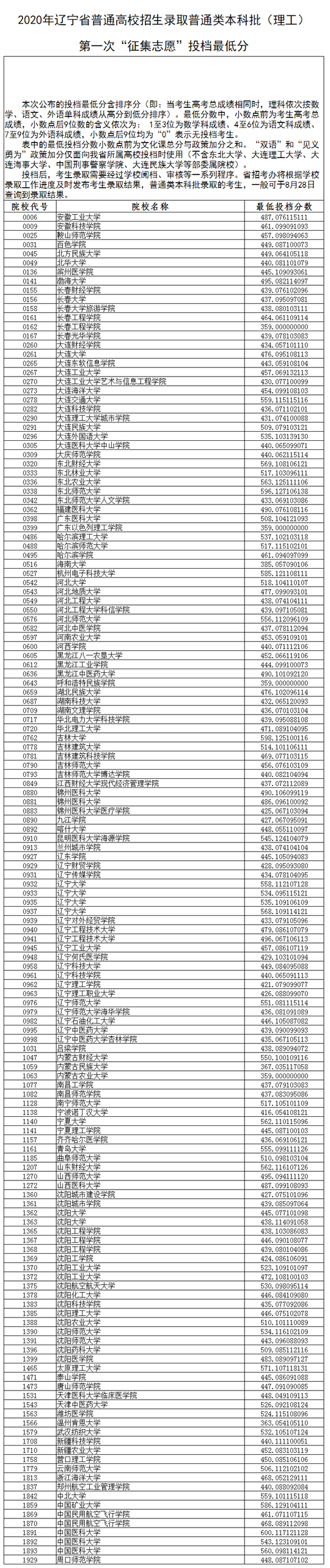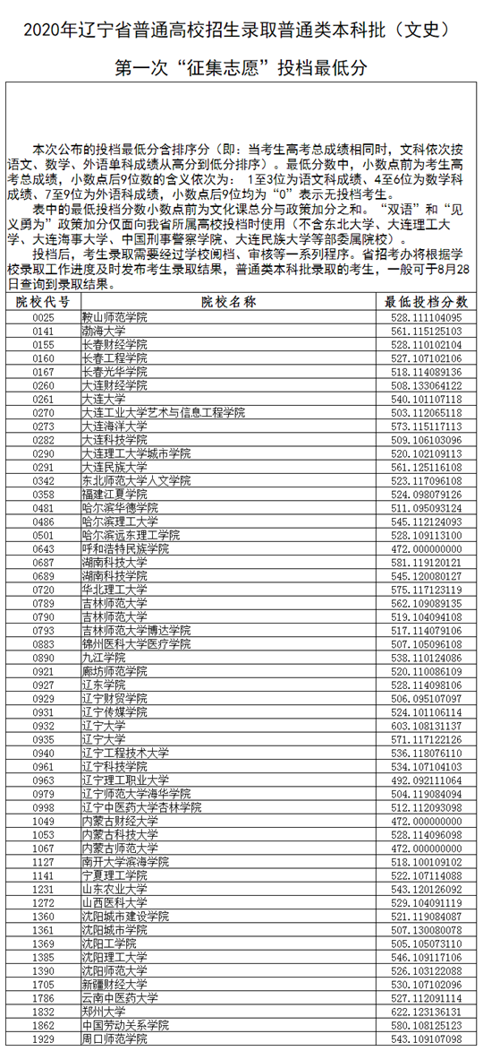2020辽宁普通类本科批第一次征集志愿投档分数线