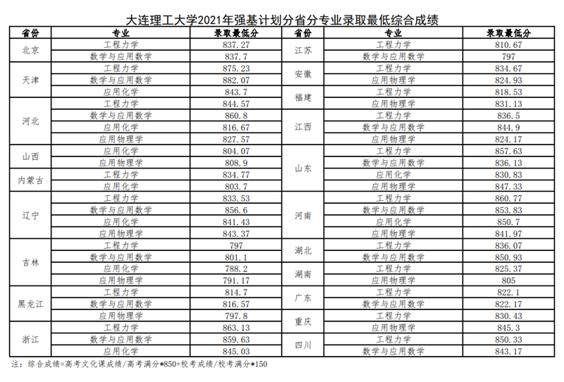 | 根据《教育部关于在部分高校开展基础学科招生改革试点工作的意见》(教学〔2020〕1号)文件要求,按照《大连理工大学2021年强基计划招生简章》有关规定,通过组织专家面试和体质测试,经学校研究同意,现发布我校2021年强基计划分省分专业录取最低综合成绩。 考生可登录我校强基计划报名平台(https://bm.chsi.com.cn/jcxkzs/sch/10141)查询本人综合成绩及录取状态,如对上述信息有异议,请于2021年7月6日17:00前以实名方式向我校招生办公室反映,招生办公室电话为:0411-84708375。 强基计划录取考生通知书邮寄工作将于7月下旬开始,请考生关注大工招生网相关通知。 大连理工大学2021年强基计划分省分专业录取最低综合成绩 ![]() |