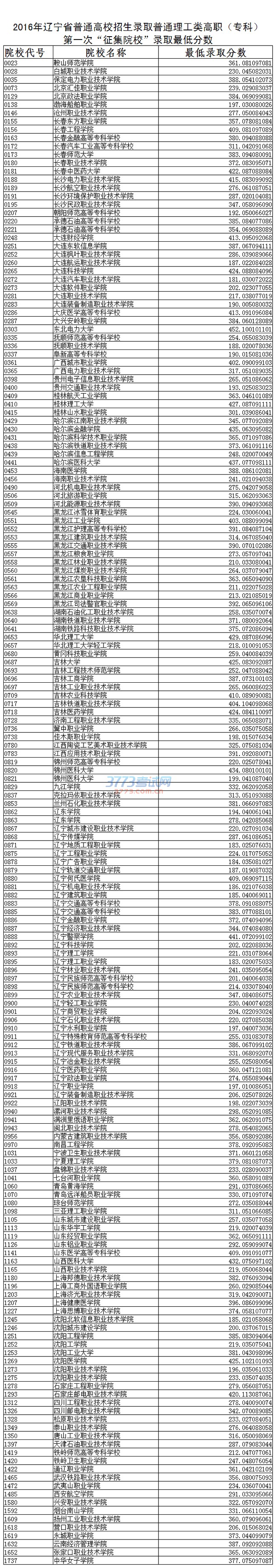 2016年辽宁省普通高校招生录取普通类高职(专科)院校第一次征集录取最低分数
