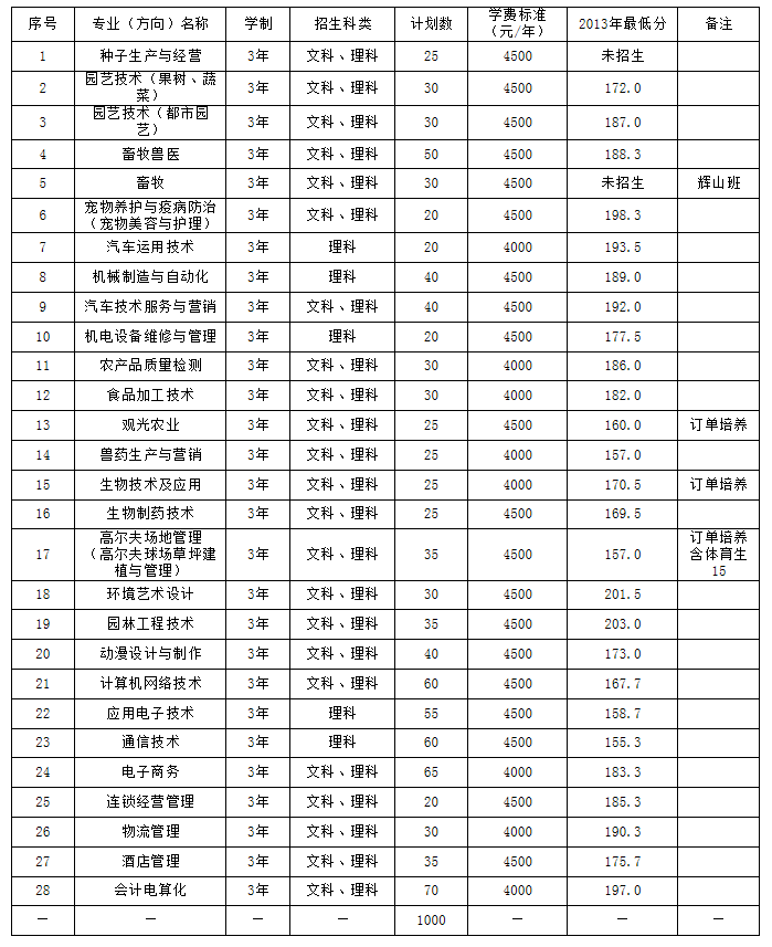 备注:畜牧(辉山班)为中国辉山乳业控股有限公司订单培养;观光农业为北京尚庄金地农业观光园、营口海外国际旅行社有限公司订单培养;生物技术及应用为上海大地园艺种苗有限公司、沈阳城市公用集团农业发展有限公司订单培养;高尔夫场地管理为嘉厚国际俱乐部(营口)有限公司订单培养。