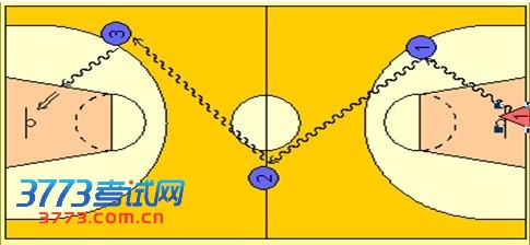 篮球场地上的标志①、②、③为障碍物。运球上篮时球须投中,投不进可进行补投(补投时投篮方式不限),若球不中仍继续带球前进,视为无效,也不予计分。