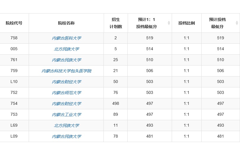 本科一批 758 内蒙古医科大学 2 519 1:01 519