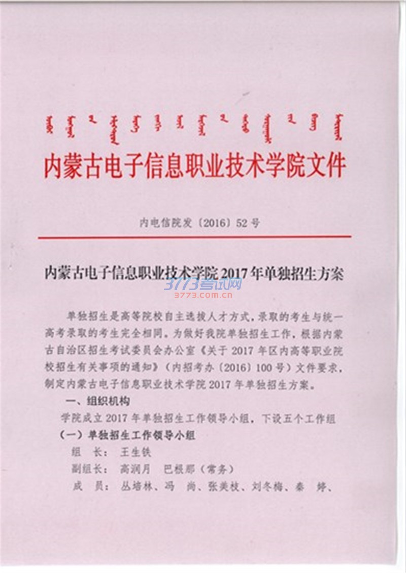 2017年内蒙古电子信息职业技术学院单招工作方案