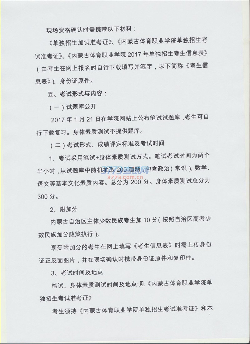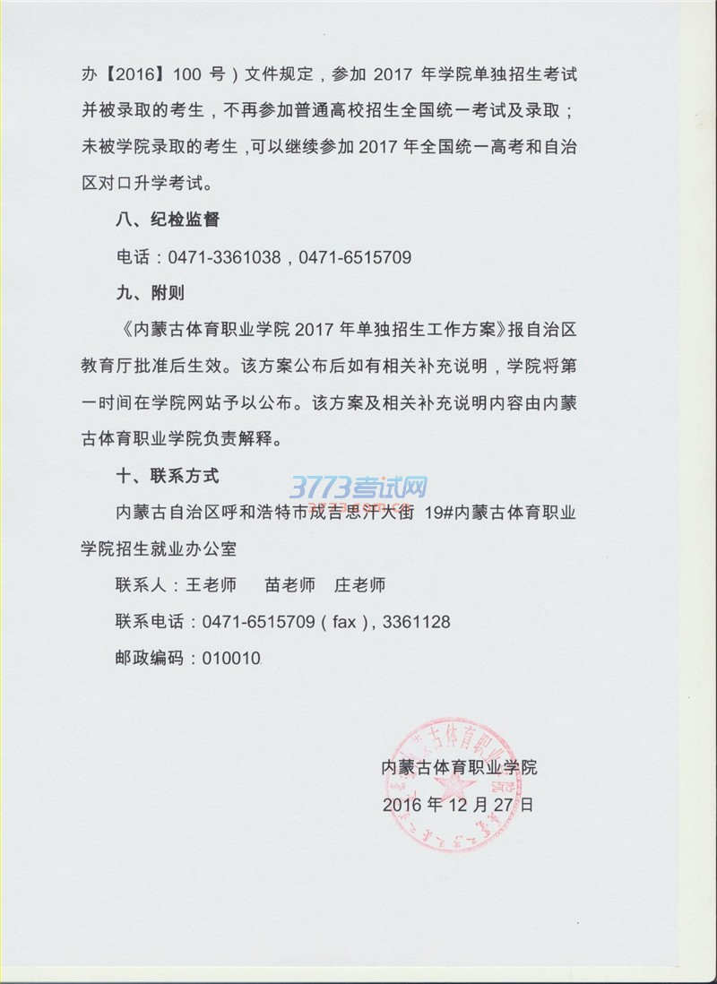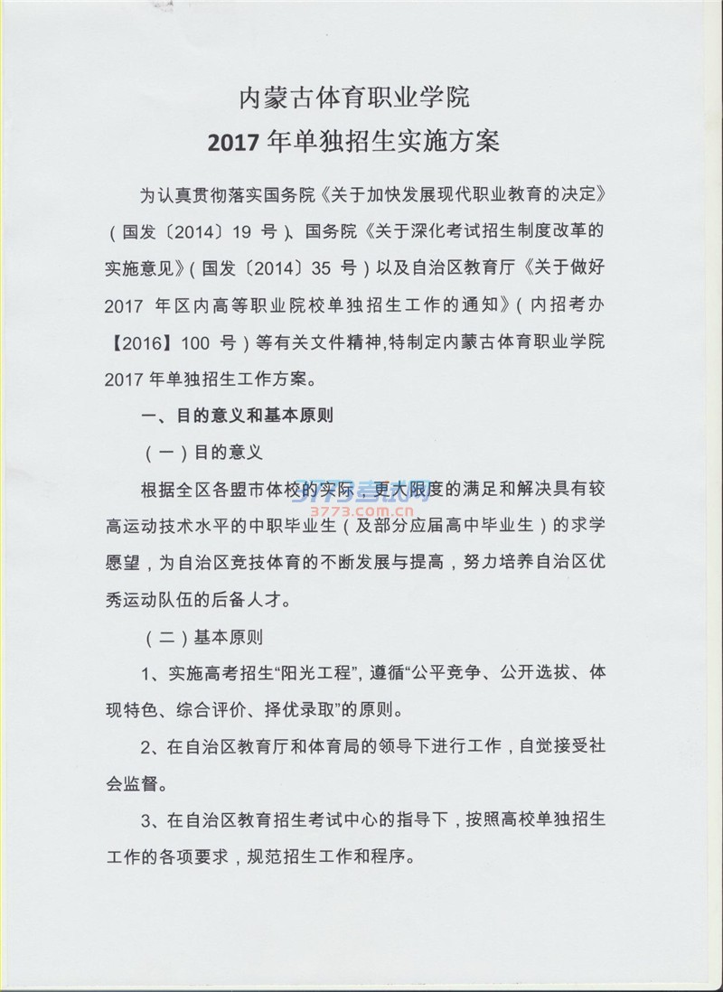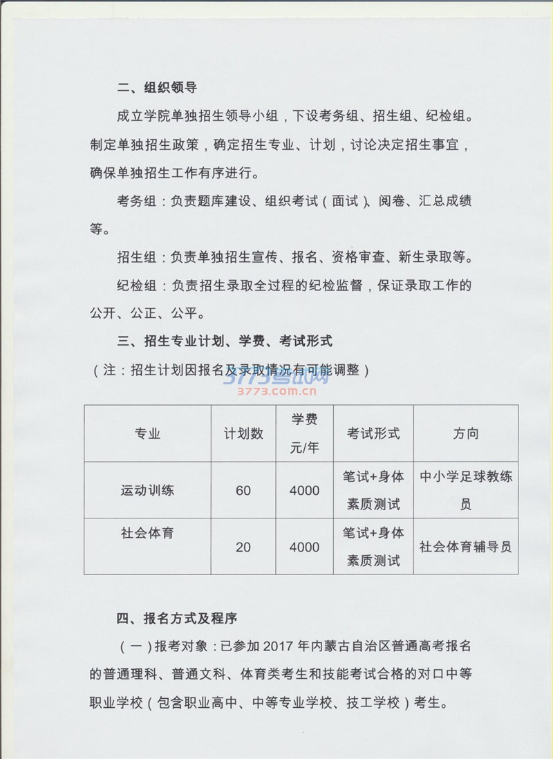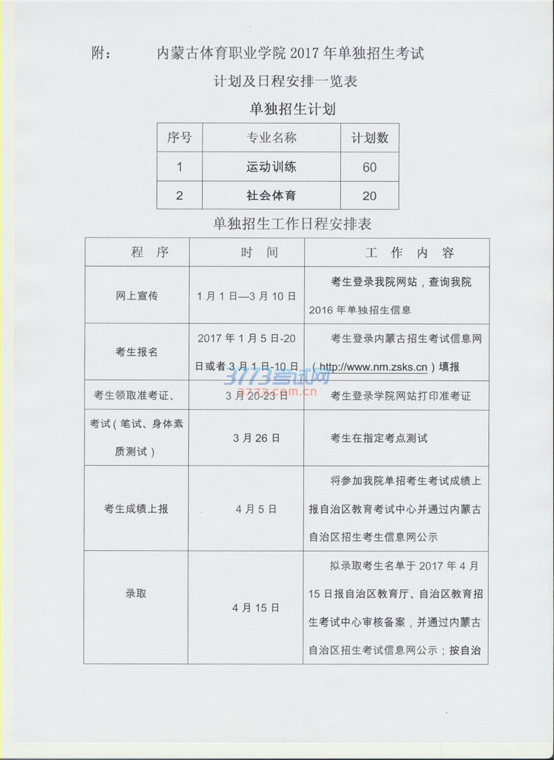 2017内蒙古体育职业学院单招工作方案